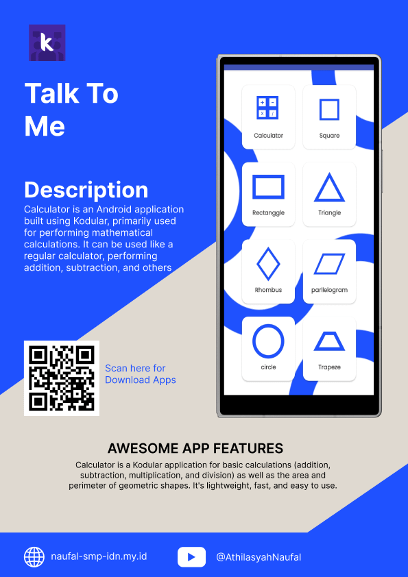 Calculator App September 10, 2025 by athilasyahnaufal with no comment Android Calculator AppsCalculator is an application developed by Kodular with two main functions: basic operations (addition, subtraction, multiplication, and division) and calculating the area and circumference of geometric shapes such as squares, rectangles, and circles Watch Demo Here Previous Post Murrotal Next Post MindMap Tata Cara Pengurusan Jenazah